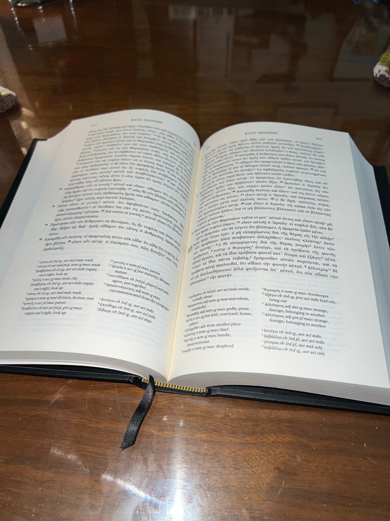 I began studying the Greek New Testament during my first semester of college in the Fall of 2008. Since that time, I have collected and read from a variety of copies, editions, and versions of the Greek New Testament. As a pastor, I reference these resources regularly in the course of sermon preparation, Bible study for pastoral counseling and teaching applications, and my own personal study and application of the Word of God. There are many great copies and editions of the Greek New Testament available today, including the NA28, the UBS5, and the Zondervan A Reader’s Greek Testament, among others.