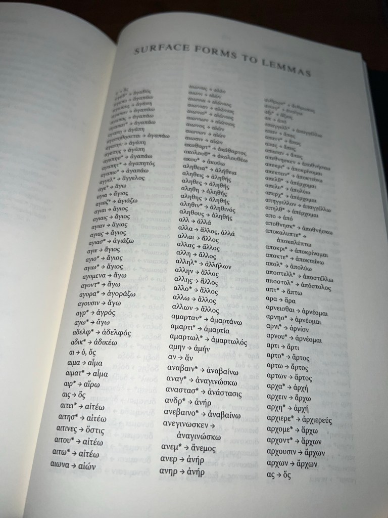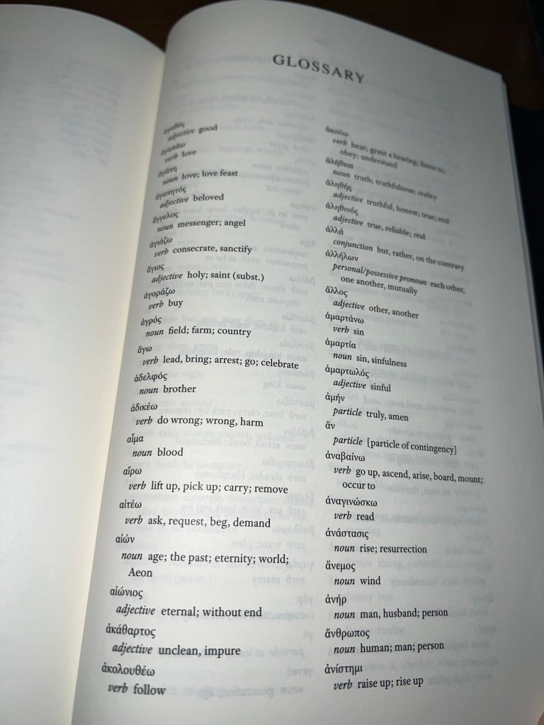 Towards the back of the work, two additional features of note are also provided. First, a section entitled “Surface Forms to Lemmas” is provided. As noted in the introduction, excluding proper nouns in the text, all words corresponding to lemmas that occur twenty-five times or fewer receive footnotes marked by numbers. For those unfamiliar with the term, a “lemma” refers to the headwords (and by extension, the whole entry) of an individual variation unit in the apparatus of the Greek text.[11] These variations are those discussed earlier that occur as part of the natural process of copying and re-copying the Greek text through the centuries. Second, a master glossary/dictionary of words occurring more than 25 times can be found. Both features are designed to “provide accommodations for holes in one’s knowledge of these words” (vix).